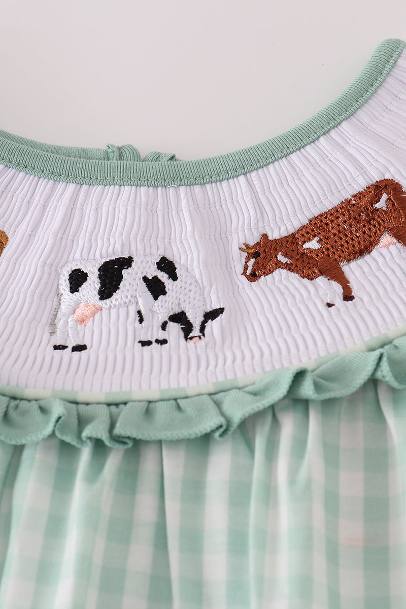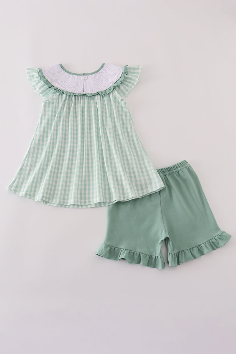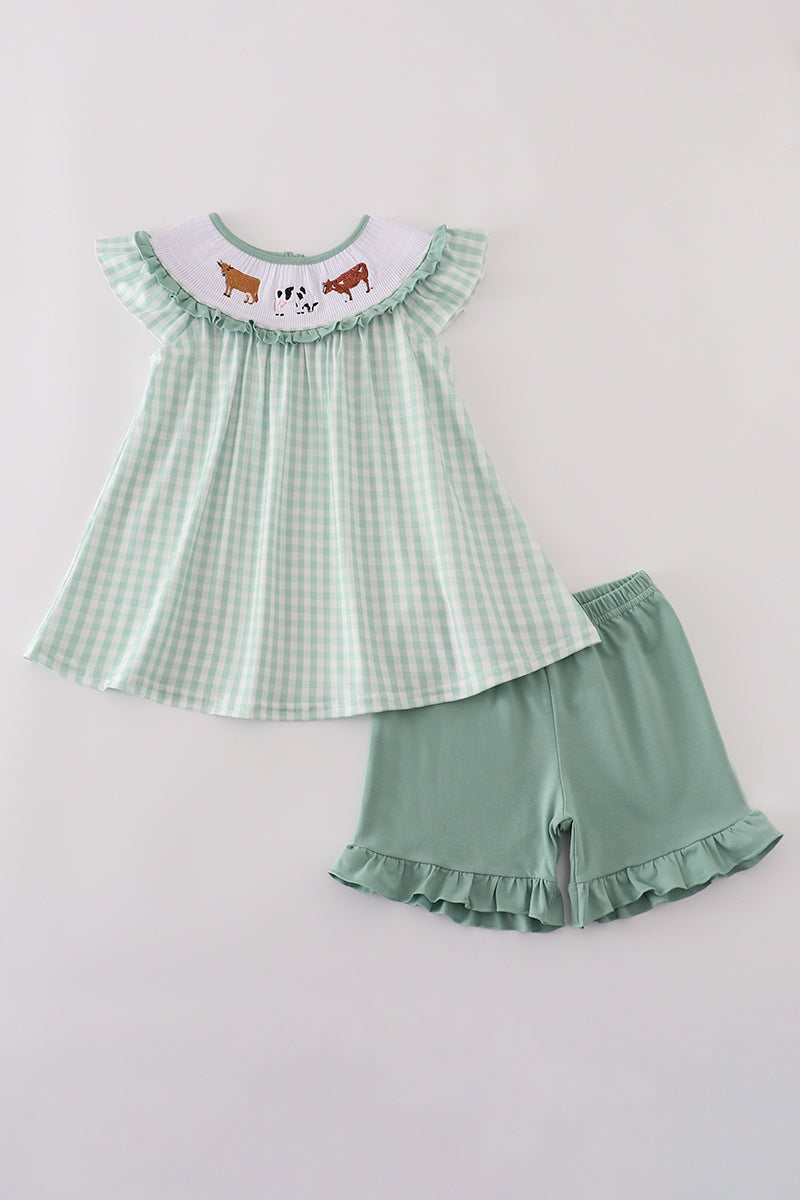 Green cow embroidery smocked gingham ruffle shorts set
