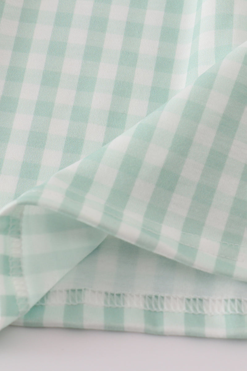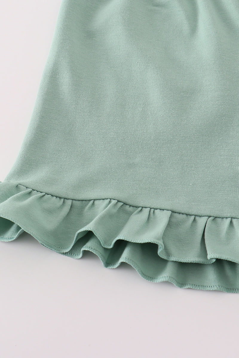 This playful green gingham shorts set features charming cow embroidery and a smocked waistband for a comfy fit. The ruffled details add a fun, flirty touch, making it perfect for sunny days and playful adventures.