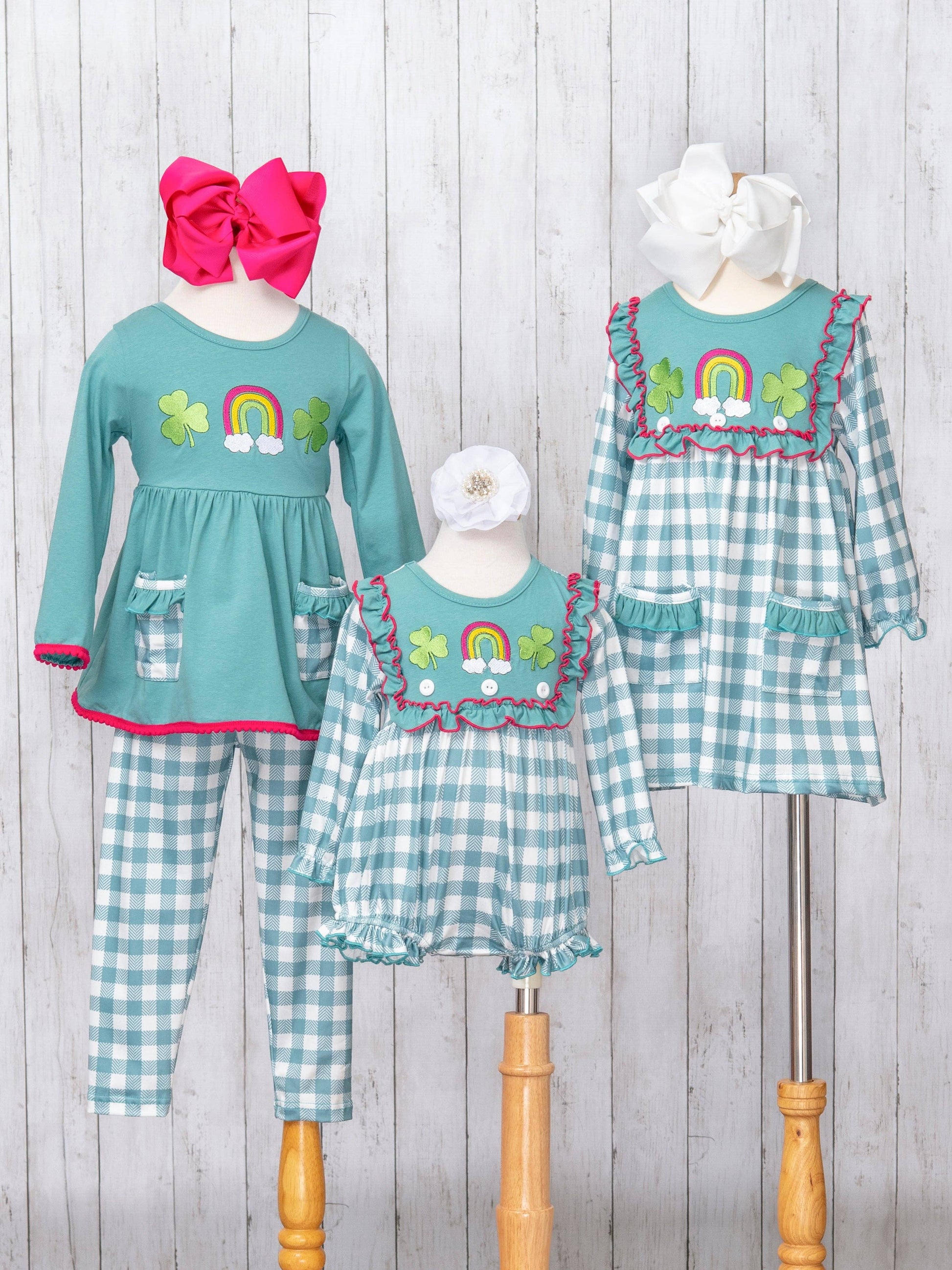 The Rainbow Clover Field Gingham Dress is the gold at the end of the rainbow! This blue-green dress by Marie Nicole Clothing features gingham, ruffle trim, cinches at the wrists, pockets, & embroidered clovers and a rainbow, perfect for St. Patrick's Day.
