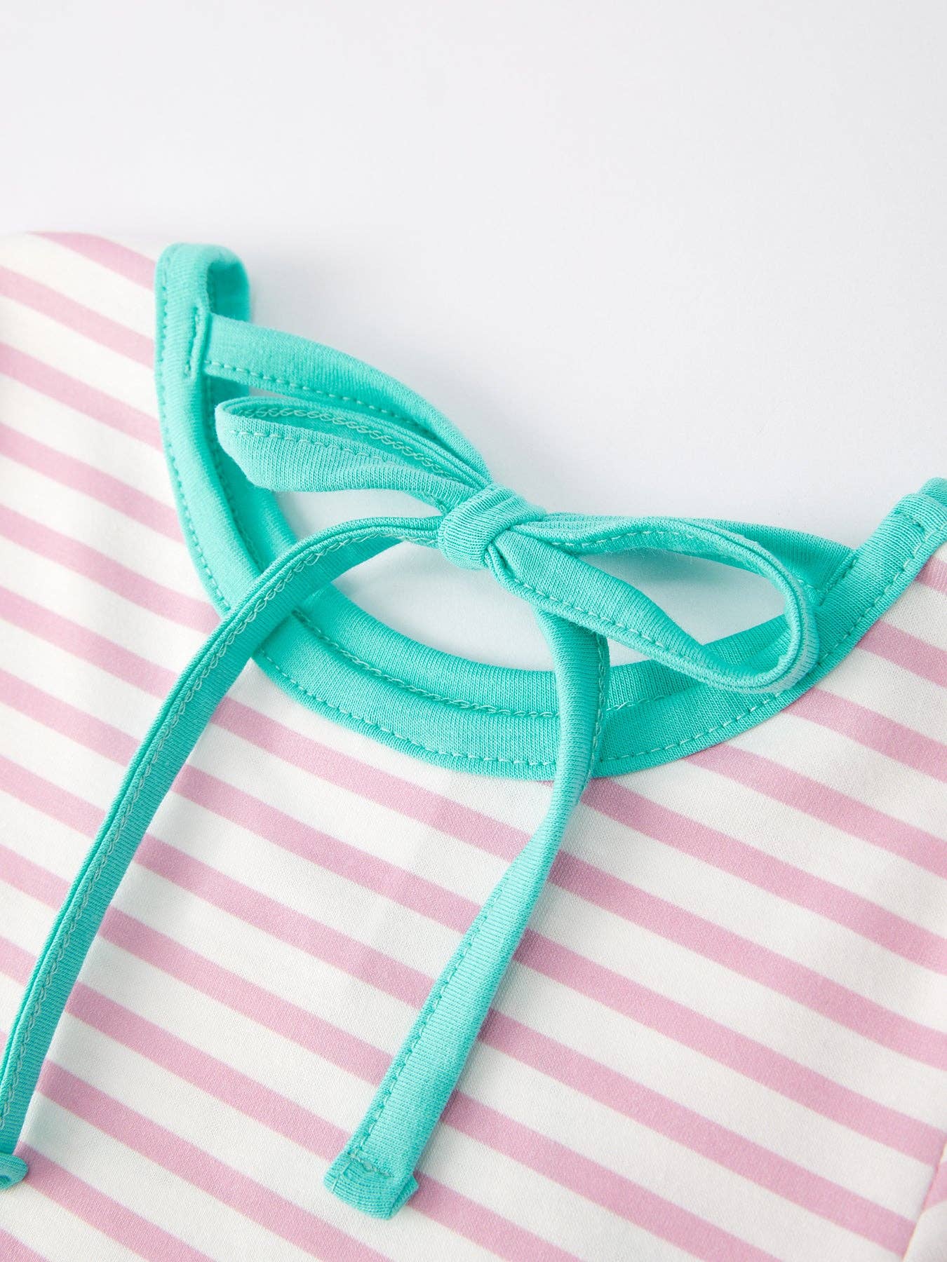 Indulge in some romantic Valentine's Day fashion with our Ruffle Stripe Smocking Embroidered Outfit Set! The delicate smocking and charming embroidered details make for a sweet and stylish choice. Show your love in this perfect outfit for a lovely evening. top: 95% polyester 5% spandex, combo: 97% cotton, 3% spandex pants:97% cotton, 3% spandex
